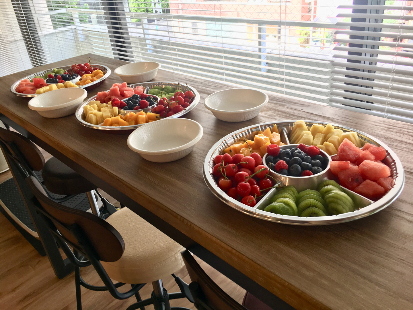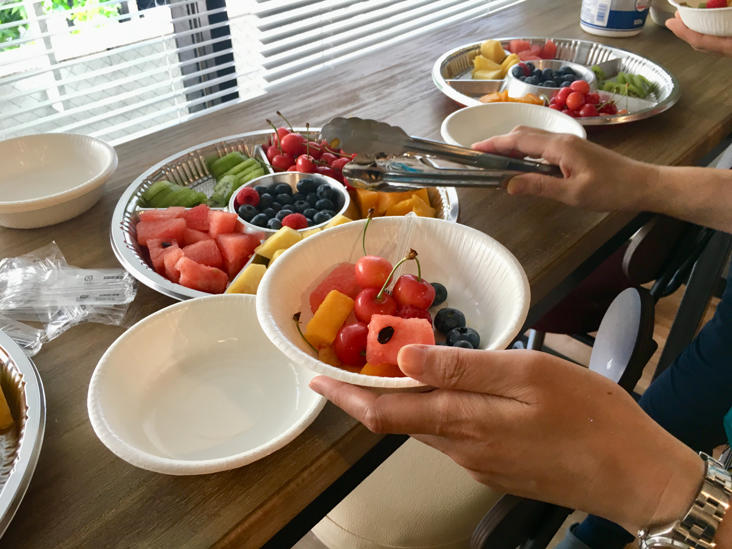 「わあーーーーーい!」「美味しそうーーーーー!」など、歓喜の声が上がりつつ、皆思い思いにフルーツを盛り付け、エネルギーチャージ😋