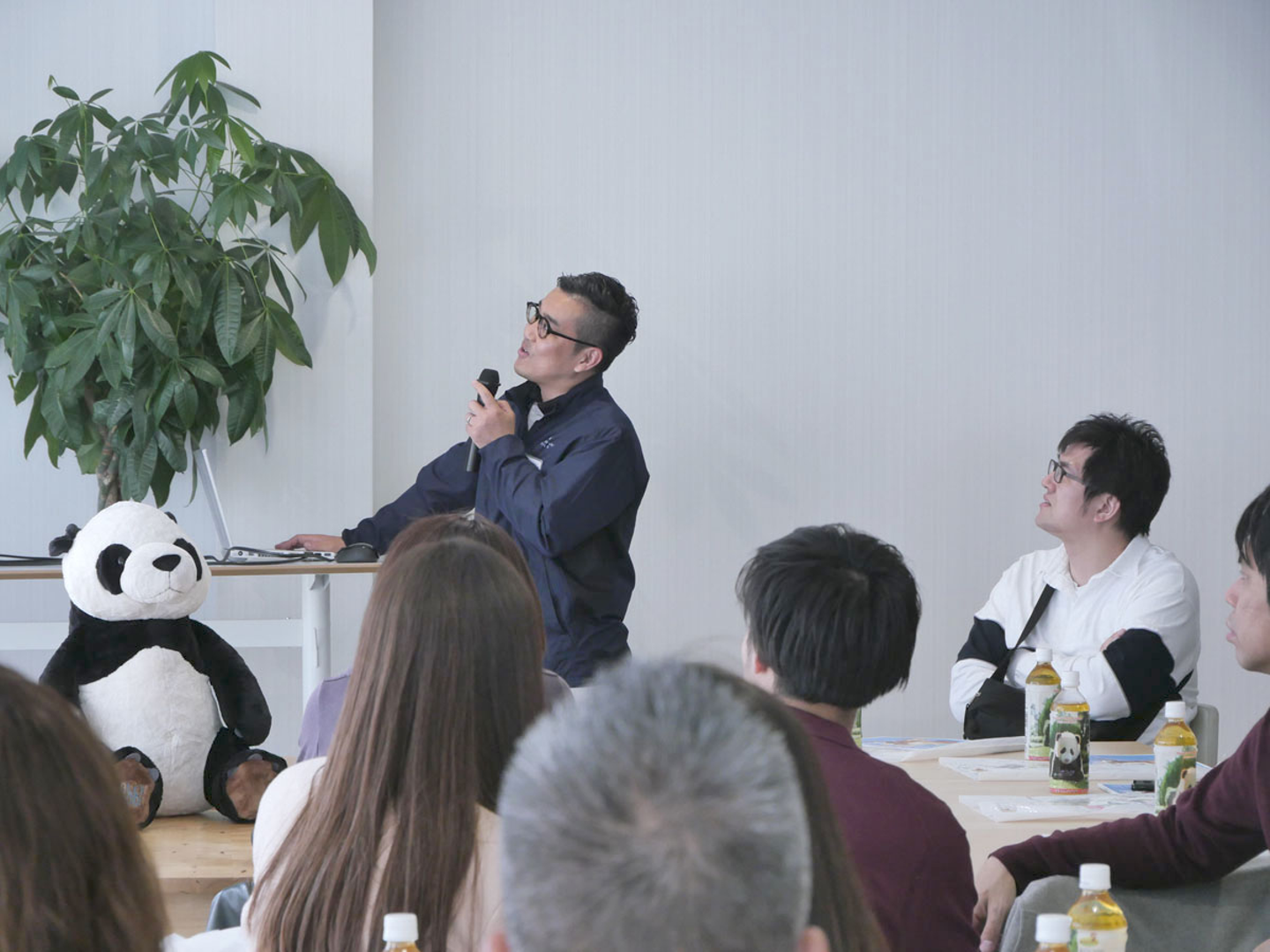山本さんがパンダのぬいぐるみで手を振ってくれています👋🐼