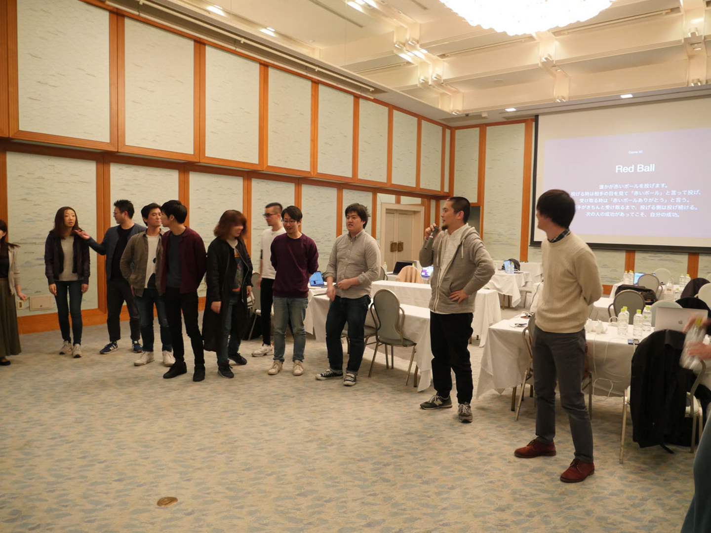 1日目のユニーク自己紹介の後にもやったのですが、こちらは目と目を合わせるコミュニケーション「赤いボール、青いボール」というもの。