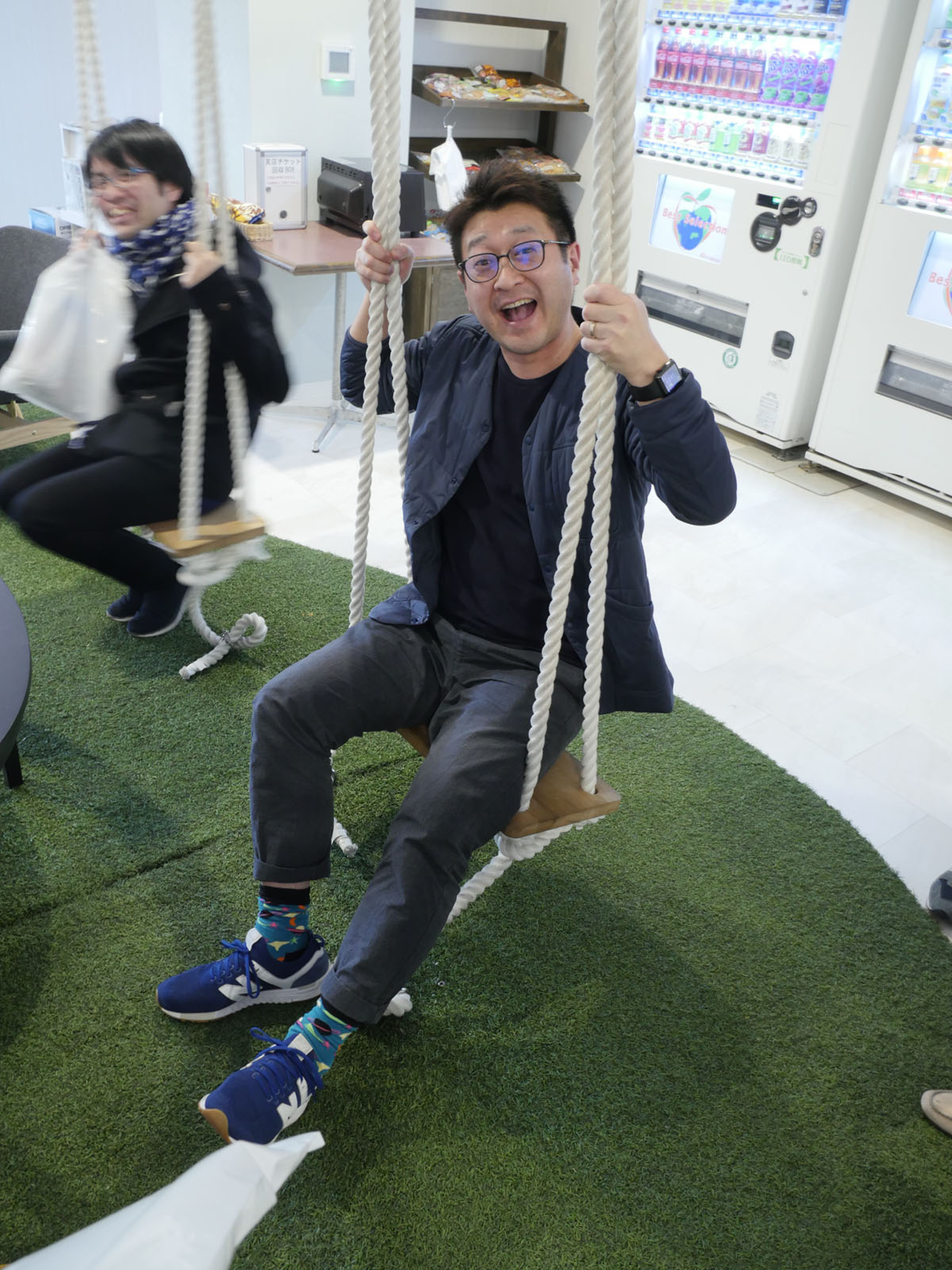 まずは、社員の健康とリフレッシュを気遣った、開放的で遊び心満載の社員食堂に案内していただきました。
