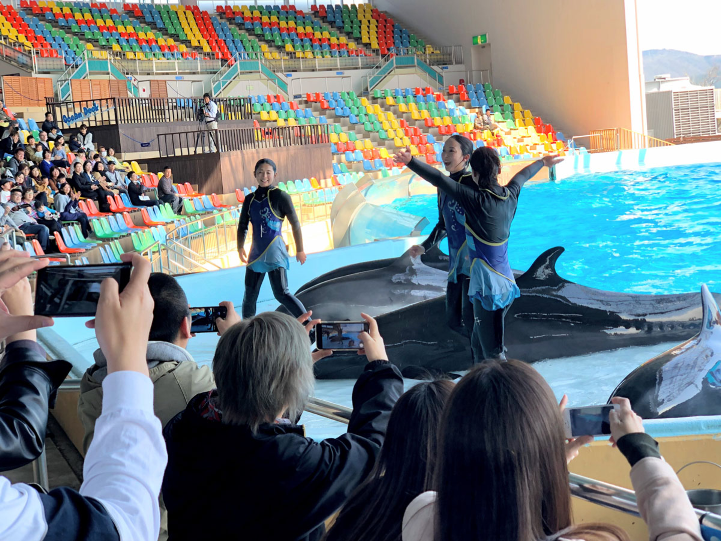 ジョリーグッドメンバーはコンテンツの中ではイルカたちも彩浜も見ていますが、実際撮影に行ったのは制作チーム数名だけのため、ほぼ全員がマリンライブを生で見るのは初めて。