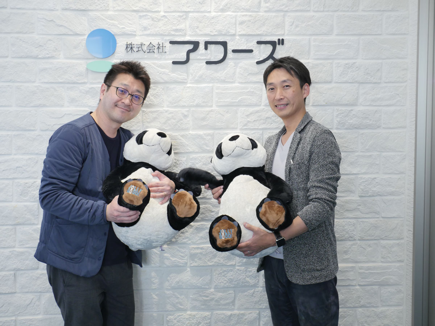 最後は、いただいたぬいぐるみ2体と、アワーズの代表取締役社長 山本雅史さんと記念写真を撮らせていただきました。