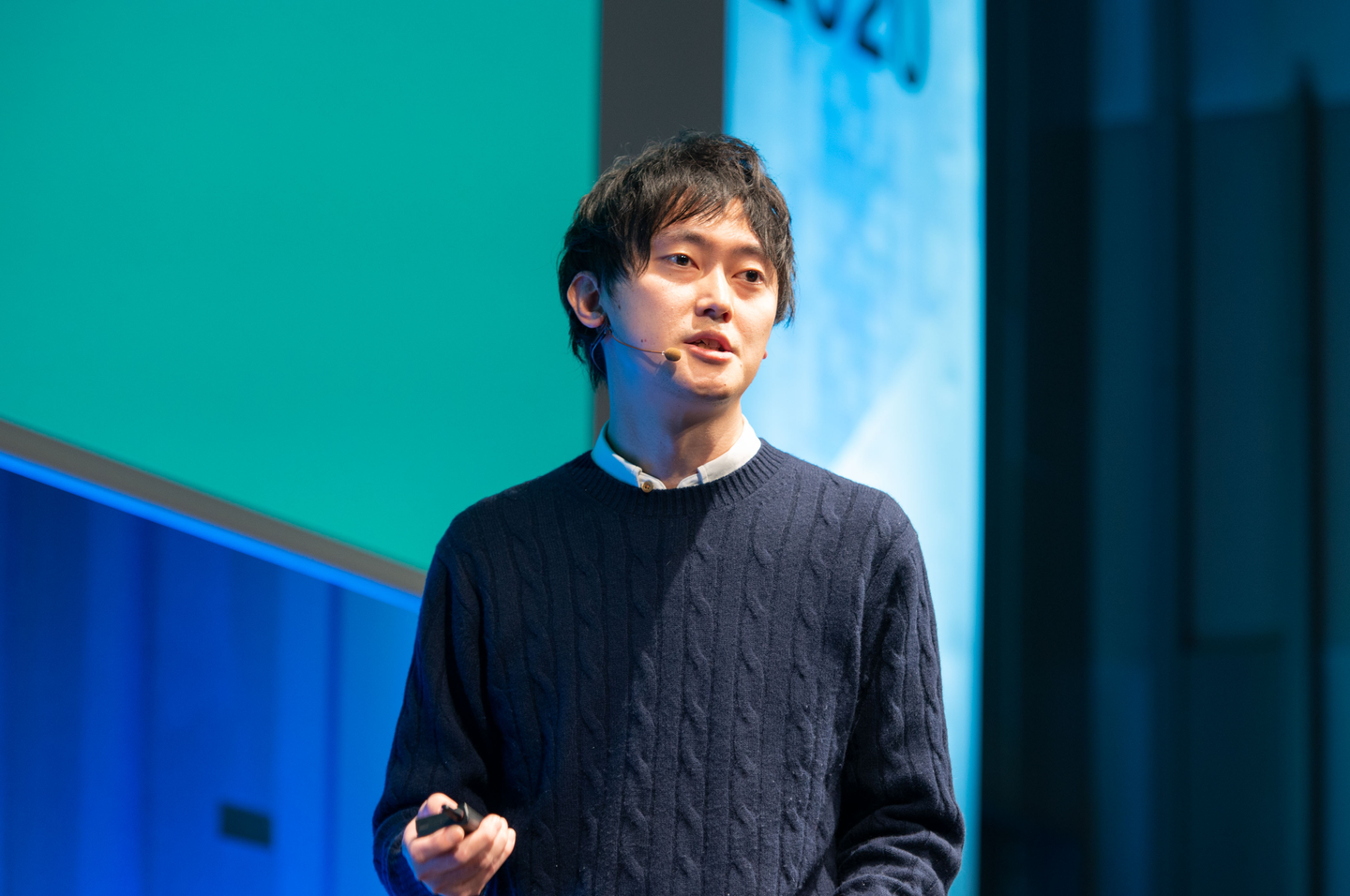 こんなに大勢の前で、堂々とプレゼンをする、emouサービス開発責任者の青木。
