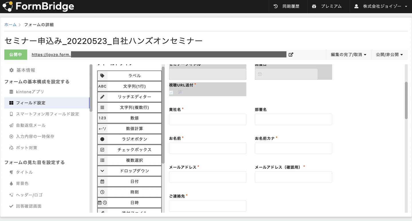 お申し込みフォームの制作には「Form Bridge」というトヨクモさんのkintone連携サービスを使います。