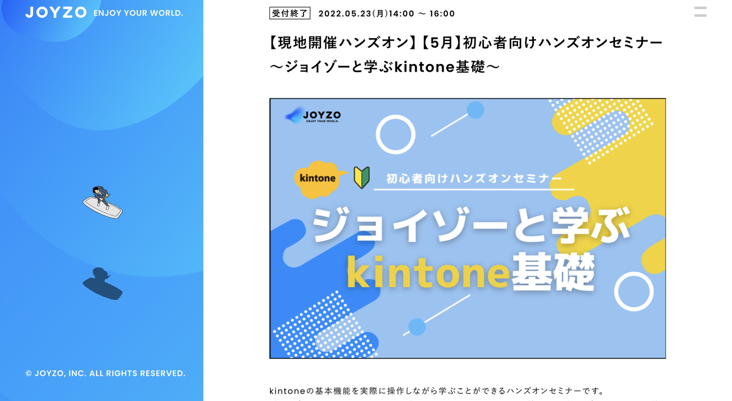 これはジョイゾーが定期開催している、ハンズオンセミナーについての告知となっています。毎月開催のものなので、先月の分を複製して変更箇所を書き換えるという方法で作成しました。最初は「コピペなら簡単そうだな」と呑気に考えていたのですが、全ての項目がきちんと埋まっているものを変える方法なので、変更できていない箇所が見つけづらいという難点がありました。実際に一通り作成してから最終確認をすると、日にちが変更できていない箇所が1つあり、急いで変更するといったことがありました。