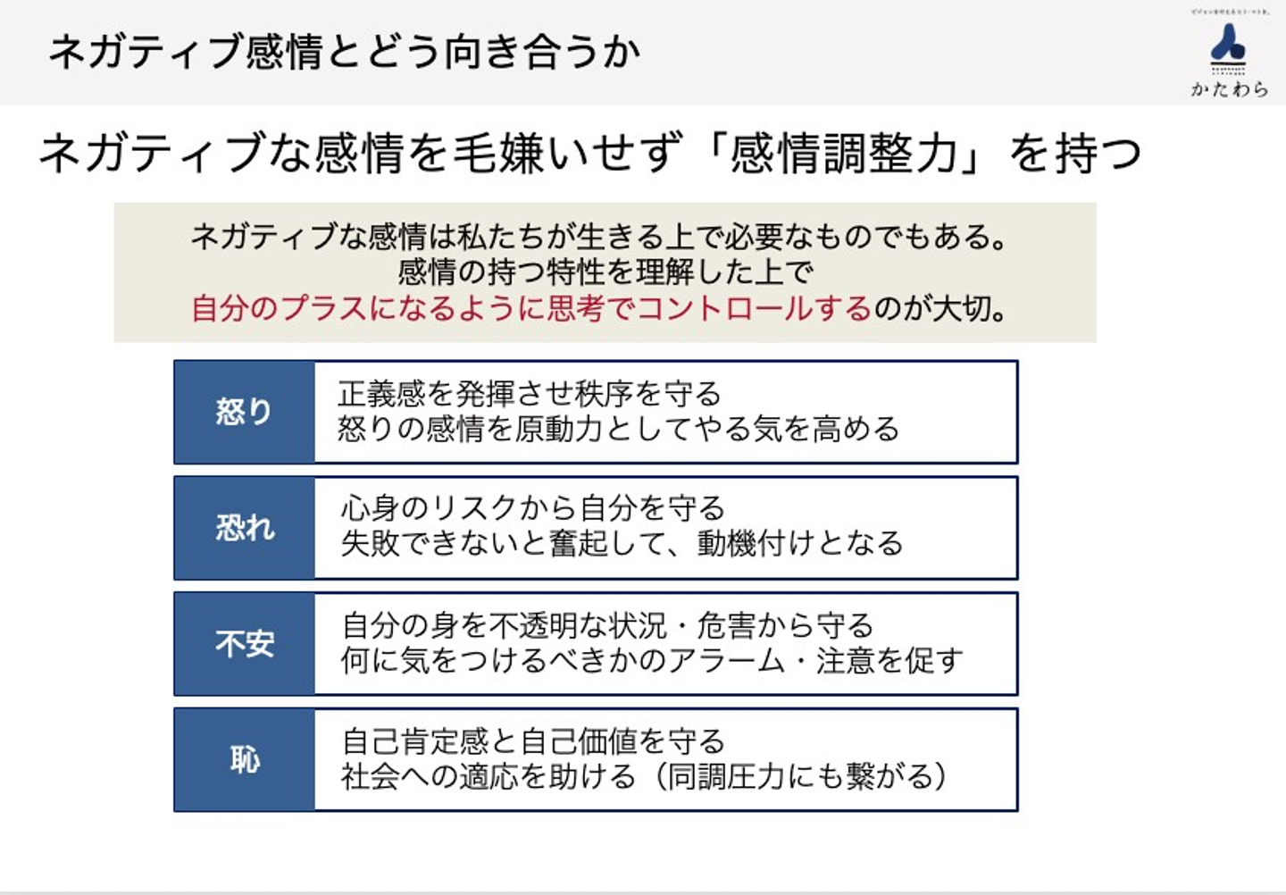 上記画像にある通り、怒り、恐れ、不安、恥、これらはすべて、「感情調整力」という形で、私たちを守ってくれているんです。この特性を理解した上で、自分のプラスになるように思考でコントロールするのが大切です。
