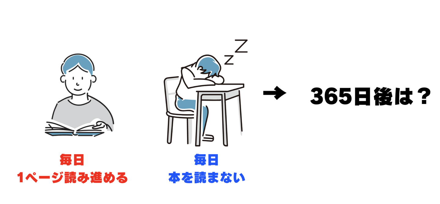想像してみてください。毎日たった1ページだけ本を読む人と、まったく本を読まない人がいるとします。1年後、2人の間にはどれほどの差が生まれているでしょうか。