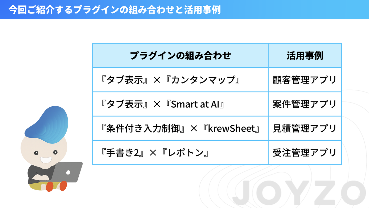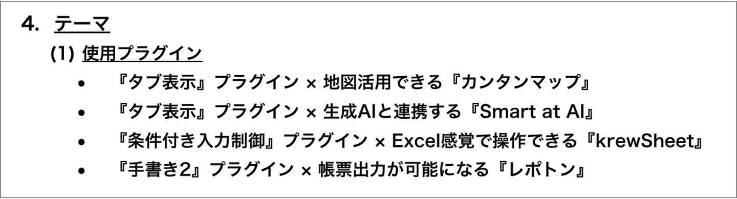 具体的には、ジョイゾーのプラグイン以外にもkintoneには豊富なプラグインや連携サービスがあり、これらのエコシステムを意識して他社製品と組み合わせることで、ジョイゾープラグイン単体で使用するよりもさらにkintoneの可能性を広げられるという訴求ポイントを持って内容を構成した良いのではないかという意見です。
