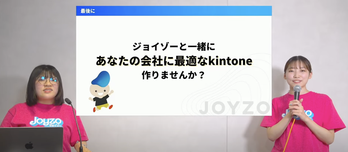 そして最後は、2人で「ジョイゾーと一緒に、あなたの会社に最適なkintone、作りませんか?」と声をそろえて締めくくり、セミナーを終えました。