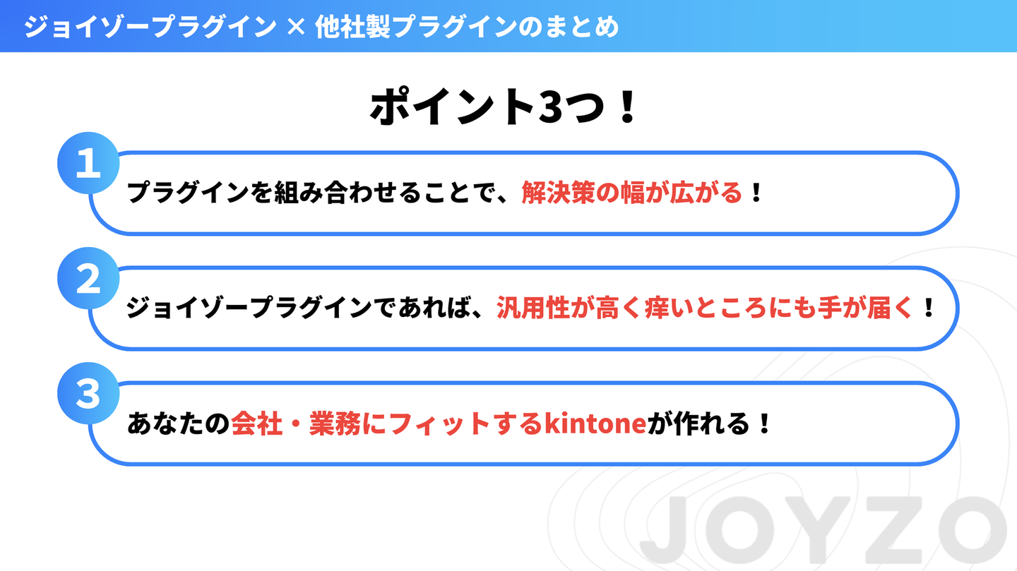 本セミナーでは、「ジョイゾープラグイン × 他社製プラグイン」という“組み合わせ”によって、kintoneの可能性がどこまで広がるのかを、デモを交えながら分かりやすくご紹介しました。
