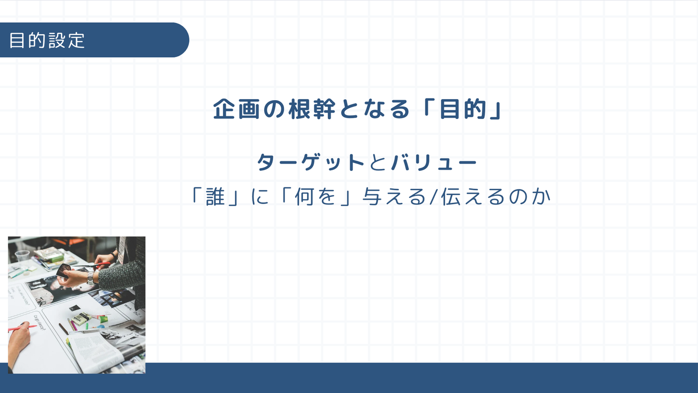 4月の新人合宿にて、この目的(ターゲットとバリュー)の設定が、企画の最重要かつ最初に決めるべき要素と教わっていたため、新人2人でじっくりと検討を重ねました。