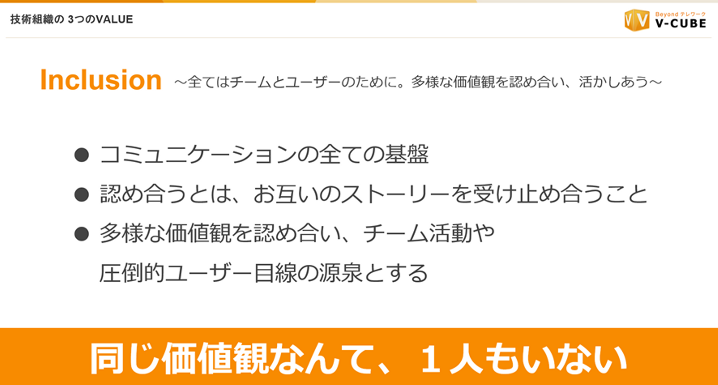 ぜひ、同じ価値観なんて、1人もいないという前提でこの多様な価値観を認め合ってチームの活動や圧倒的ユーザー目線の源泉としていただきたい。ということでInclusionということを入れています。