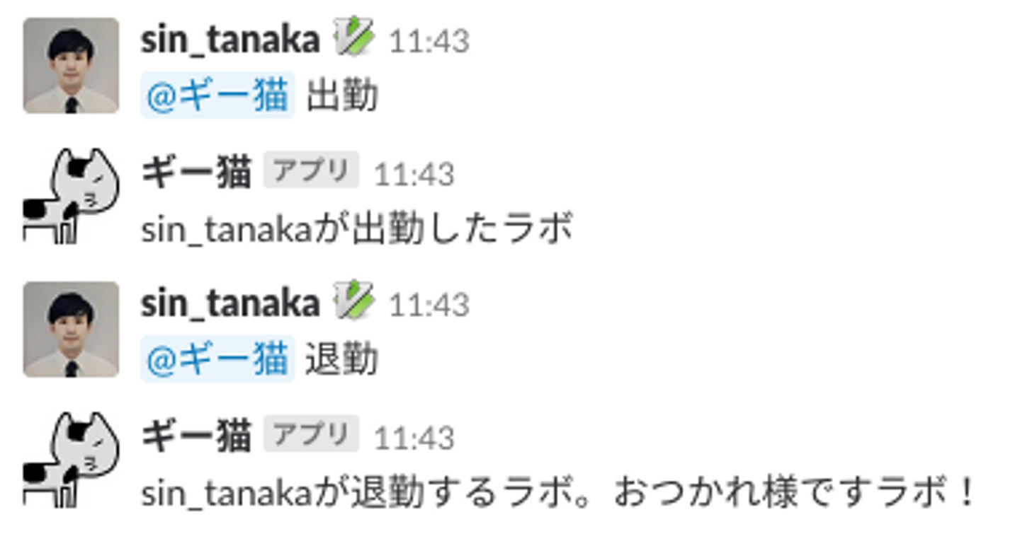 弊社のSlackBotはPythonで書かれています。名前はギー猫です。弊社併設のイベントスペースGeekLab.NAGANOにちなんで名付けられています。