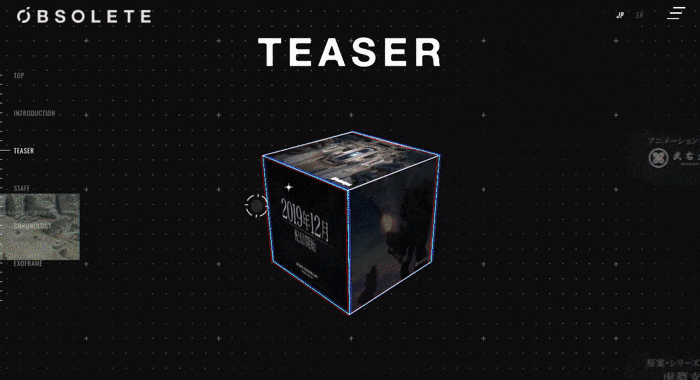 そこで、アニメ制作会社である株式会社 武右ェ門様より、作品内の3Dモデルデータを共有いただき、Web用にポリゴンを軽量化しWebGL技術による演出を加えることで、サイト内の世界観の表現に活用することができました。