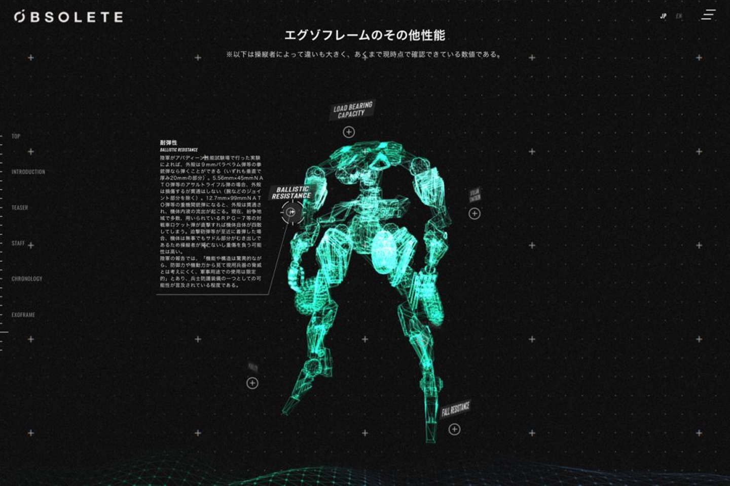 画面内に“エグゾフレーム”の躯体を登場させ、コンテンツを閲覧する人のタッチやマウス操作により、独自のアクションを起こすことで、それがもつ未知の技術と、それに対する作品への期待感を生み出しています。