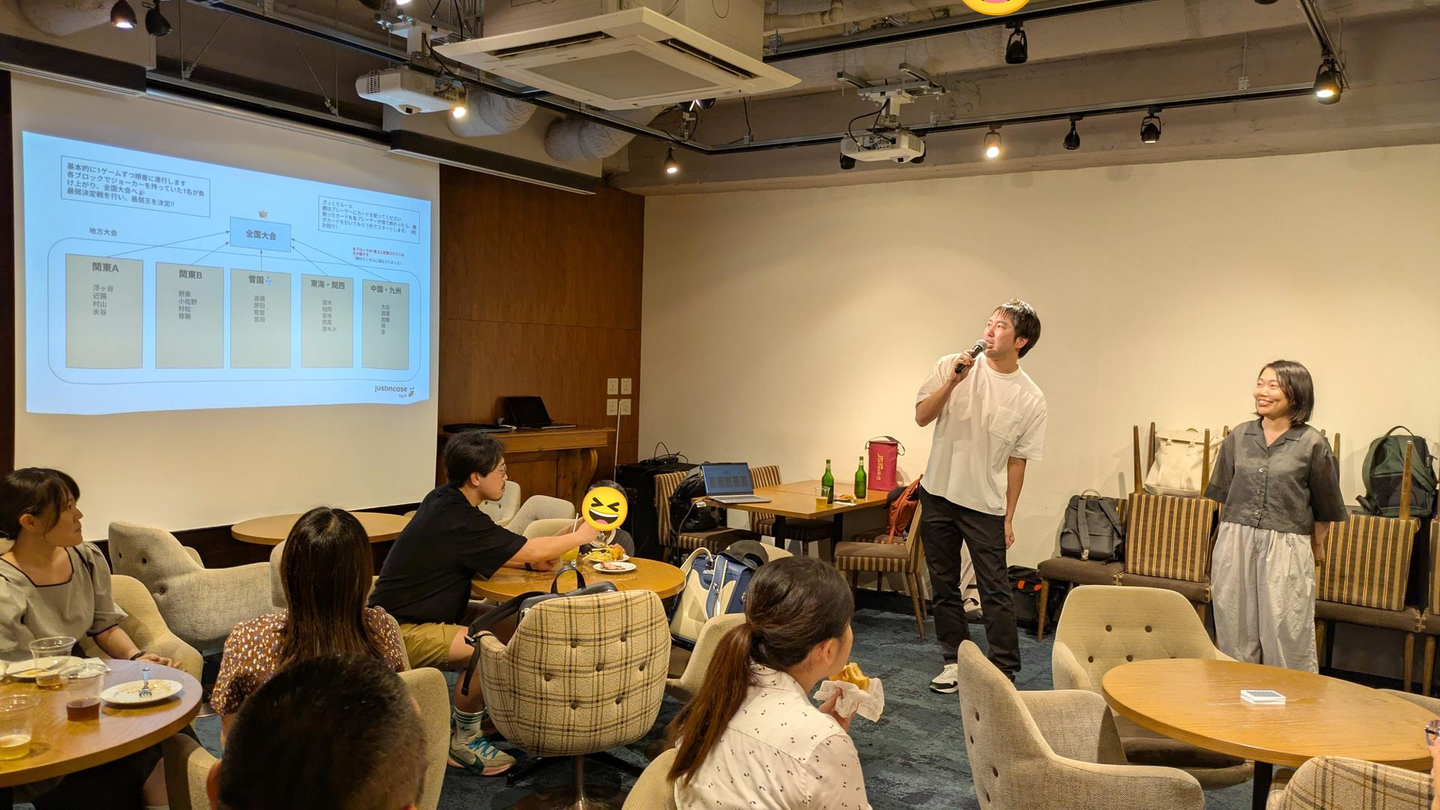 冒頭、イベントの発起人でもあるQAエンジニアの原田からチーム分けが発表されました。参加者は事前に出身地又は縁のある土地を申請しており、チーム分けはその地域ごとに行われました。その結果、通常の業務ではあまり関わらないメンバー同士の組み合わせが実現し、各所で新たな交流が生まれていました。