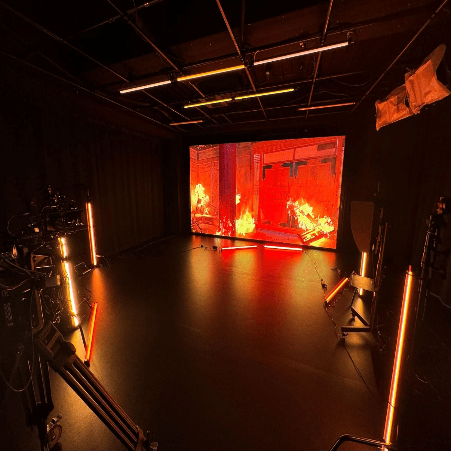 スタジオ内の照明は、四方に赤と黄色のチューブライトを配置し、点滅効果を加えることで、全方位から炎に照らされているような雰囲気を演出しています。当初、天井に吊るした照明をDMX信号で点滅させようとしましたが、単純なON/OFFのみになり無機質な印象になりました。そのため、床にT字に組んだ照明を設置し、明るさがフェードで変化するエフェクトを採用しました。
