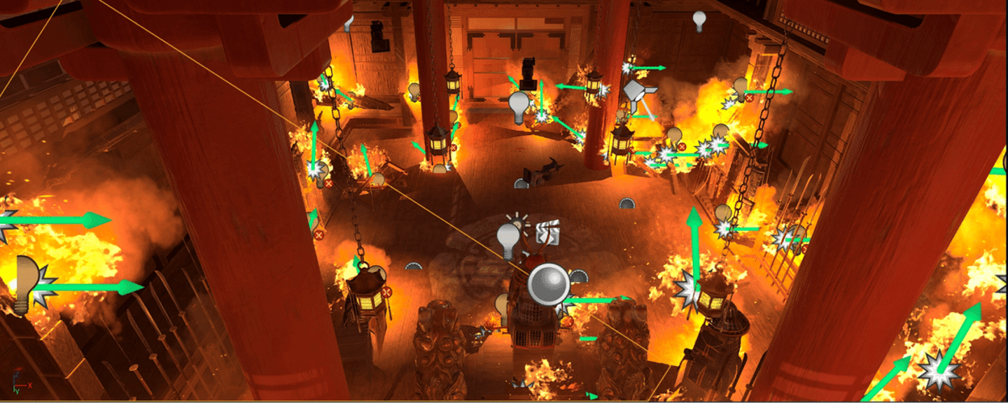 鍛錬のシーンと同じデータを複製し、炎のエフェクトや倒れた柱等を追加して室内が燃え広がっているような荒れた状態を表現しています。