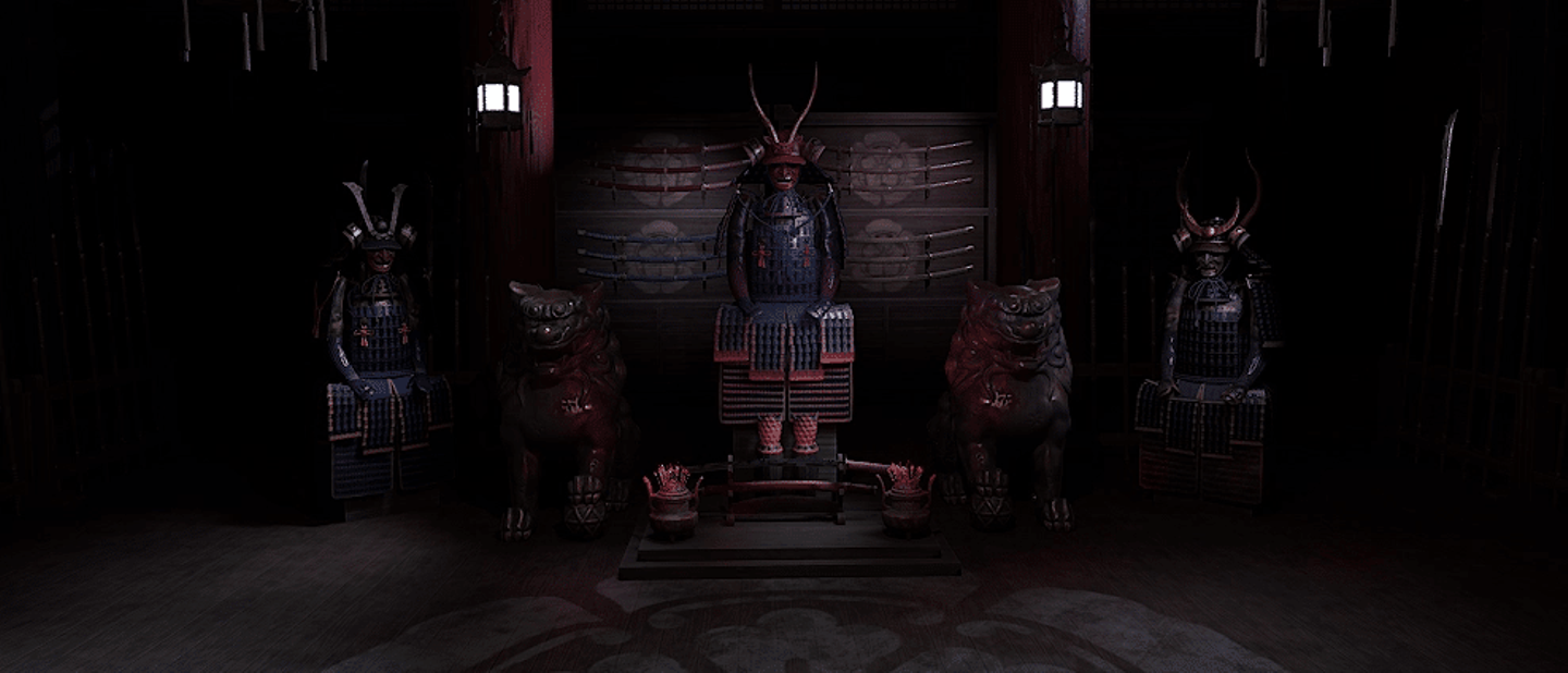 道場風のアセットをベースに、全方位の作りこみを行い、青白いライティングを施して夜の静かな雰囲気を演出しています。