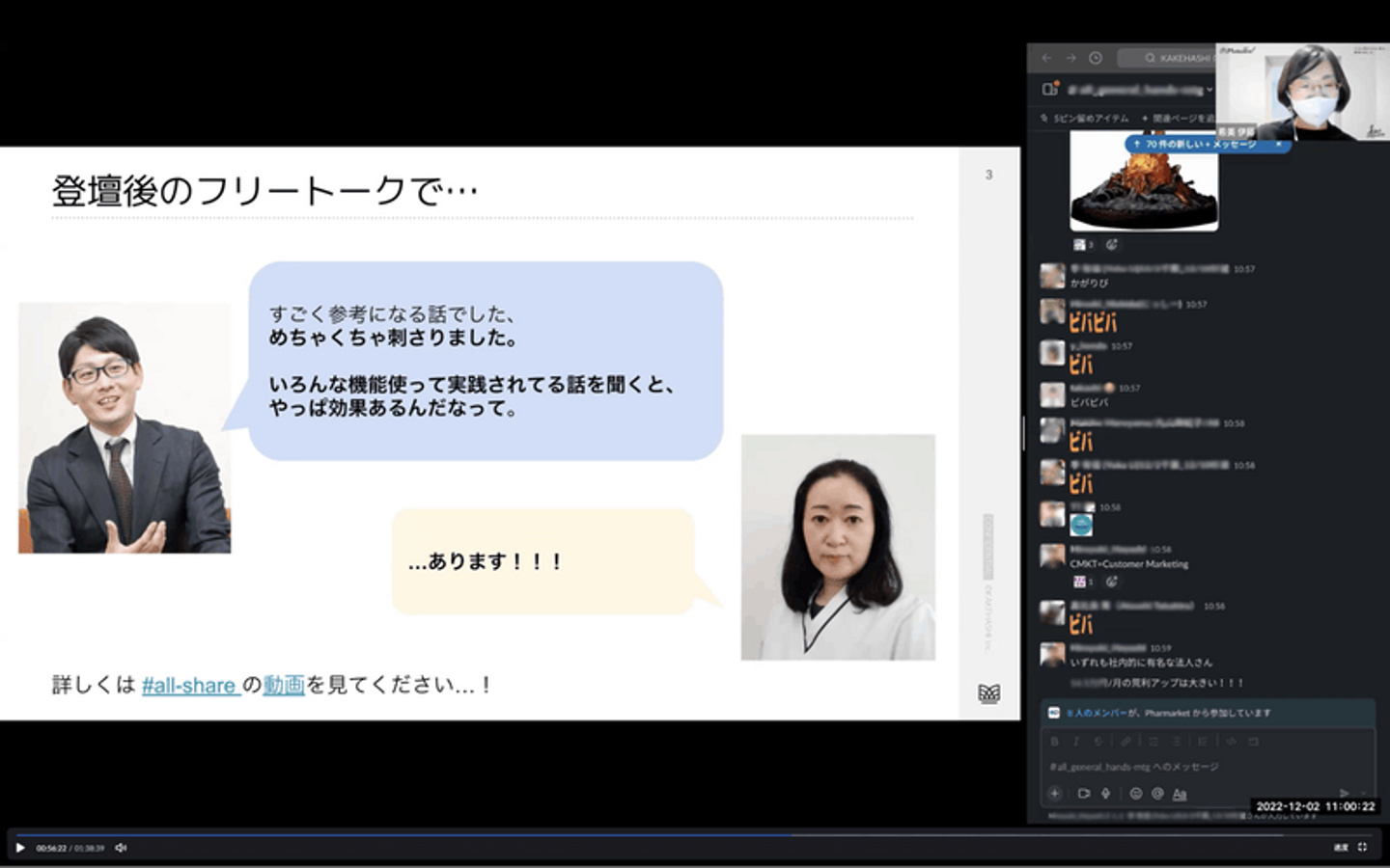 今回は普段より一層うれしいニュースやお客さまの喜びの声などをご紹介する時間が多く、最後まで温かな雰囲気で行われた全体会議。