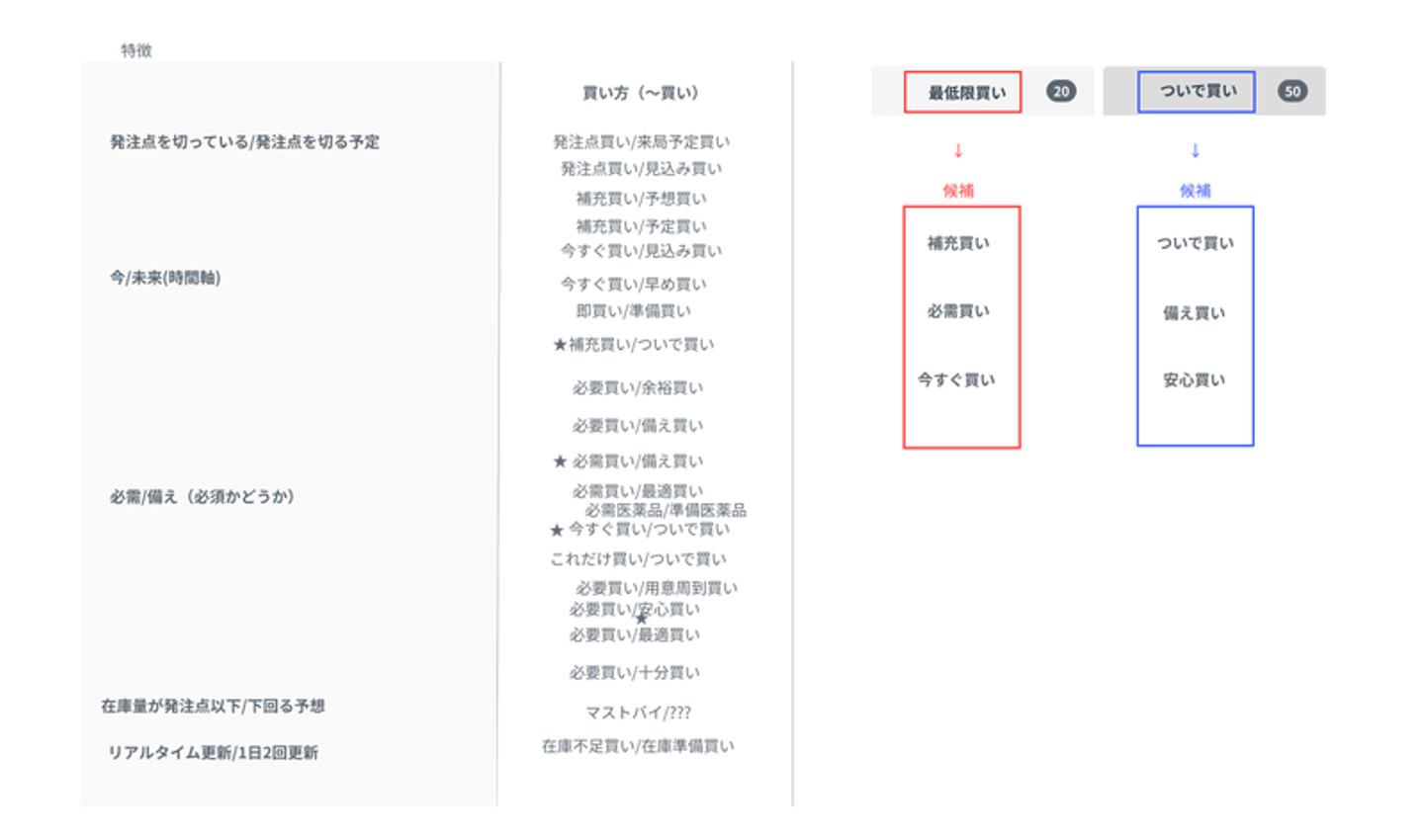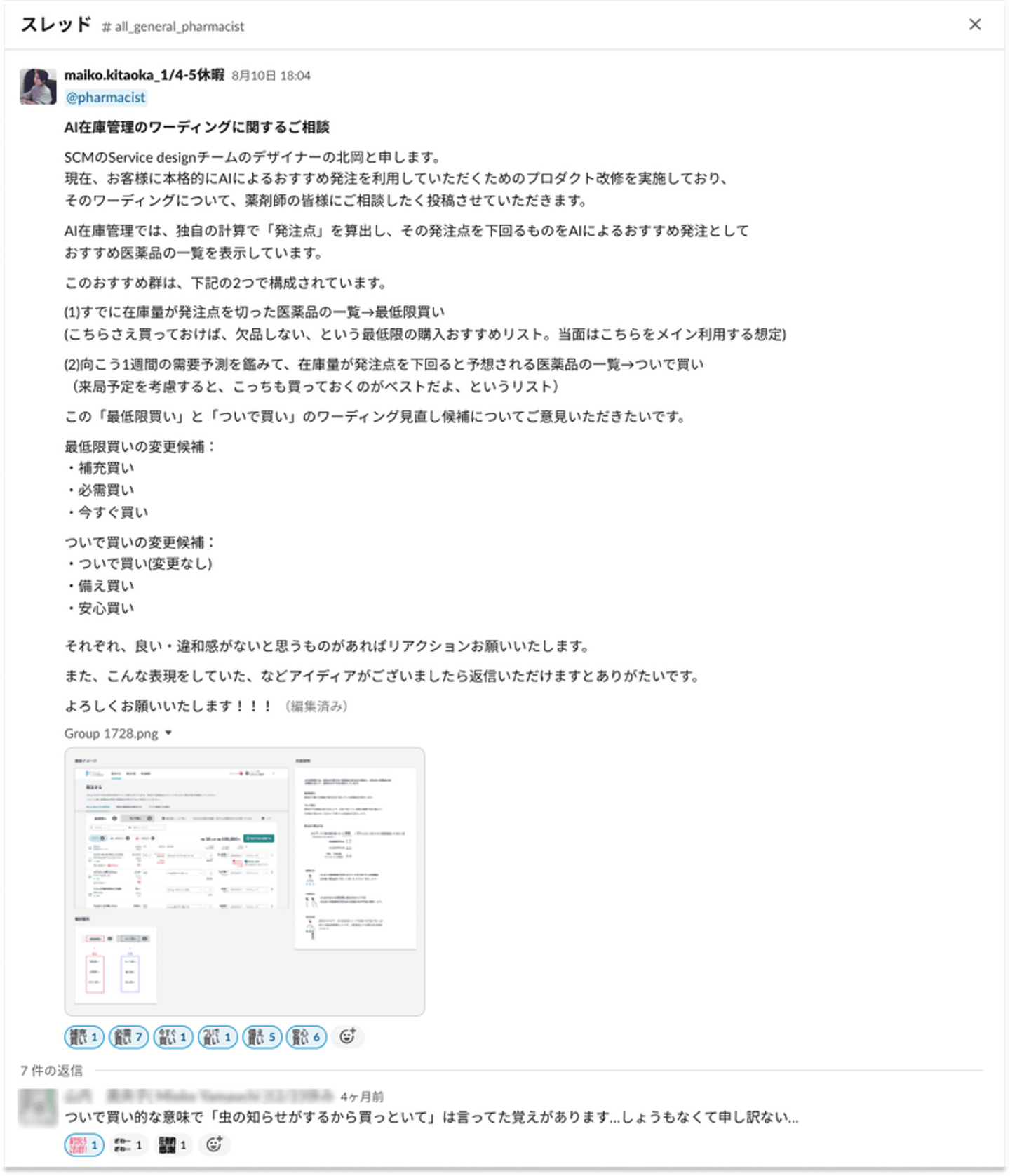 意味としての正しさを担保しつつ、呼びやすさも大事・・・すぐに浮かんだのはマストバイでしたが、AI在庫のお客様の傾向として、横文字はNGがよく出る(あと軽すぎる)ので却下。複数の案を考え、社内Slackには#all_general_pharmacist という薬剤師のドメインエキスパートの方が集うチャンネルで相談し、投票頂きながら、決めていきました。