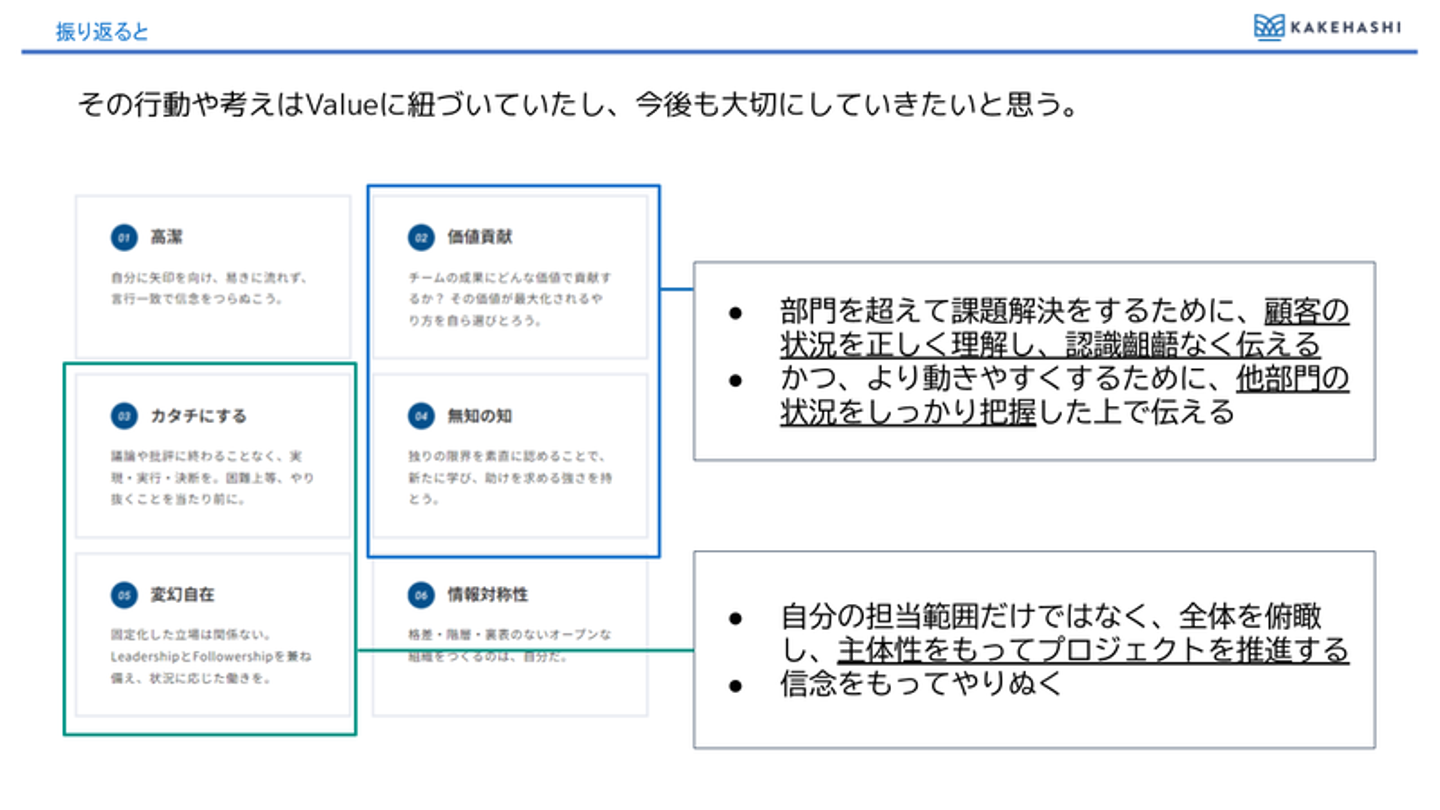 カケハシには「価値貢献」「無知の知」「変幻自在」というValueがあります。