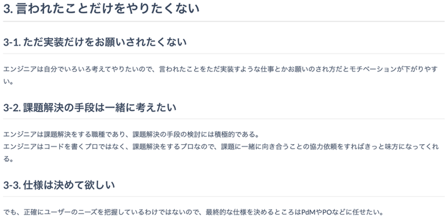 特にこの「言われたことだけをやりたくない」という点は、プロダクトマネージャーがエンジニアと一緒に仕事をする上でポイントになる部分だとも言えると思います。