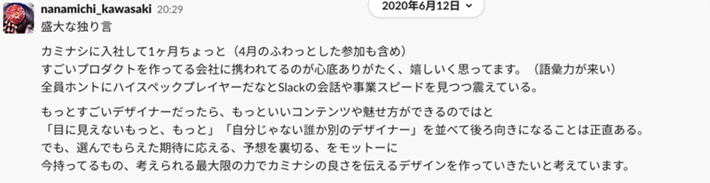 今までの失敗やコンプレックスと向き合い、自分のやりたいことを言語化することができ、「カミナシ」という心から推したいプロダクトと組織に出会えました。