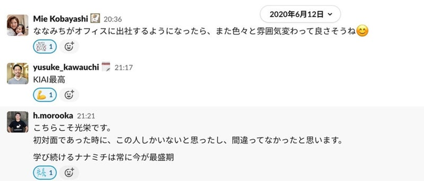 また、Slackの個人チャンネルは仕事のことなど自由に呟けるようになっています。スタンプで反応しあったり、ちょっとした誤字から気軽にコミュニケーションをとってくれる人ばかりで、フルリモートでの仕事に不安はなくなりました。
