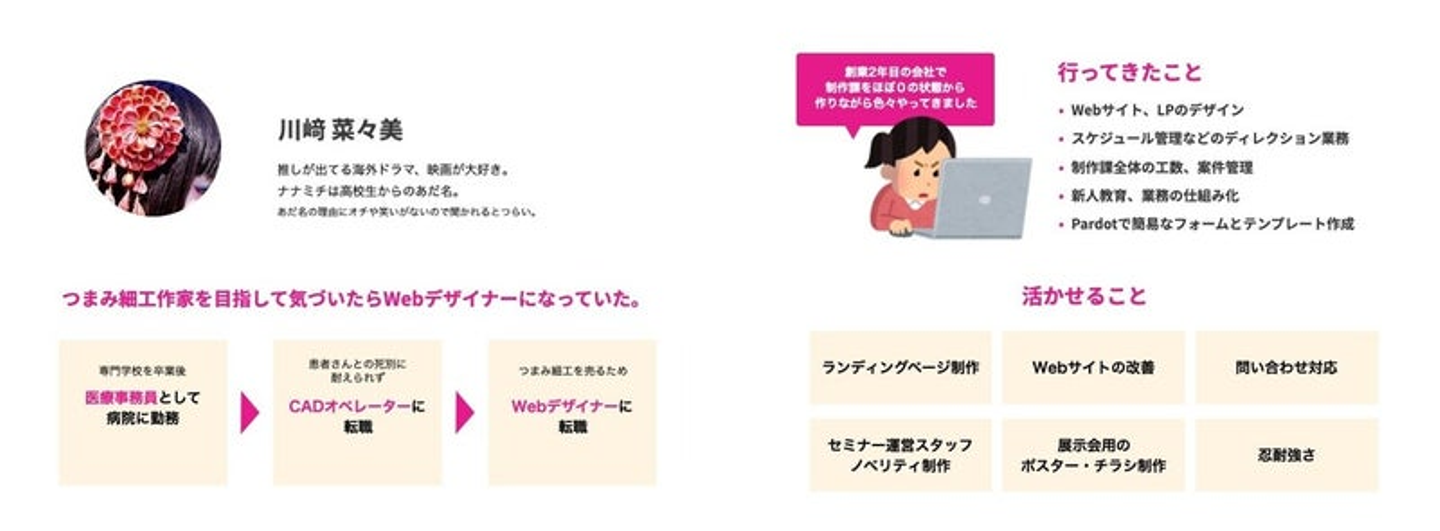 その頃には、つまみ細工よりWebデザイナーの仕事が好きになり、制作だけでなくマネジメント業務やインハウスチームでのお問い合わせ対応、セミナー運営など幅広い経験させてもらいながら6年半働いてきました。