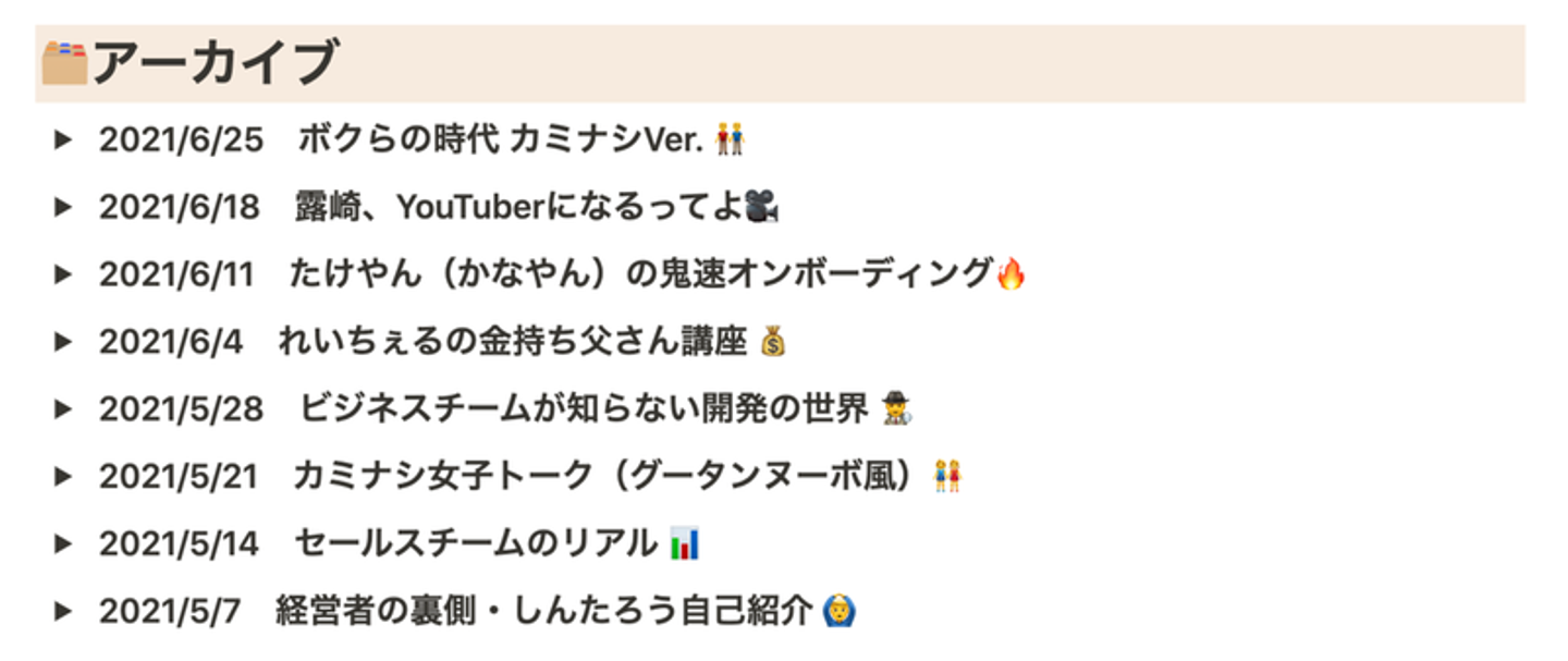 ちなみに、これまでに放送した分はNotionでアーカイブして社内公開しているので、参加できなかったメンバーは後追いも可能になっています。