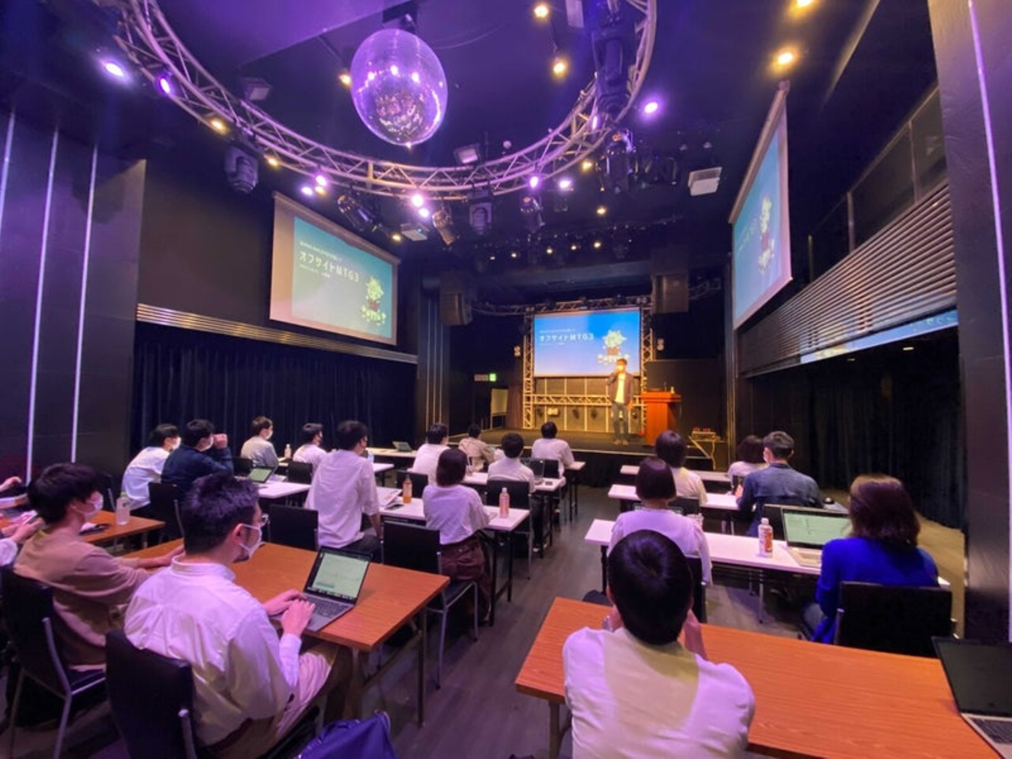 コロナ禍ということもあり、30名のところ100名規模の会場を貸し切って、密にならないように配慮し、感染予防対策を万全に開催することができました。ミラーボールもついているパーティー会場ですが、内容はいたって真面目。