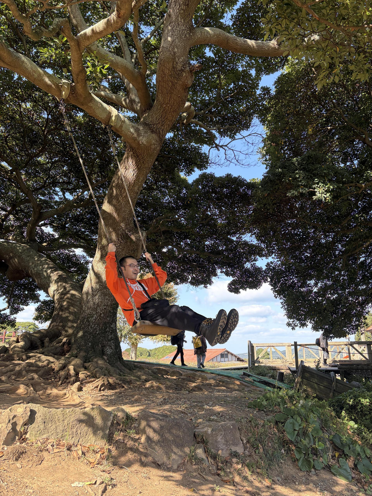 普段はクールなエンジニアも、笑顔で木の下をスイング。