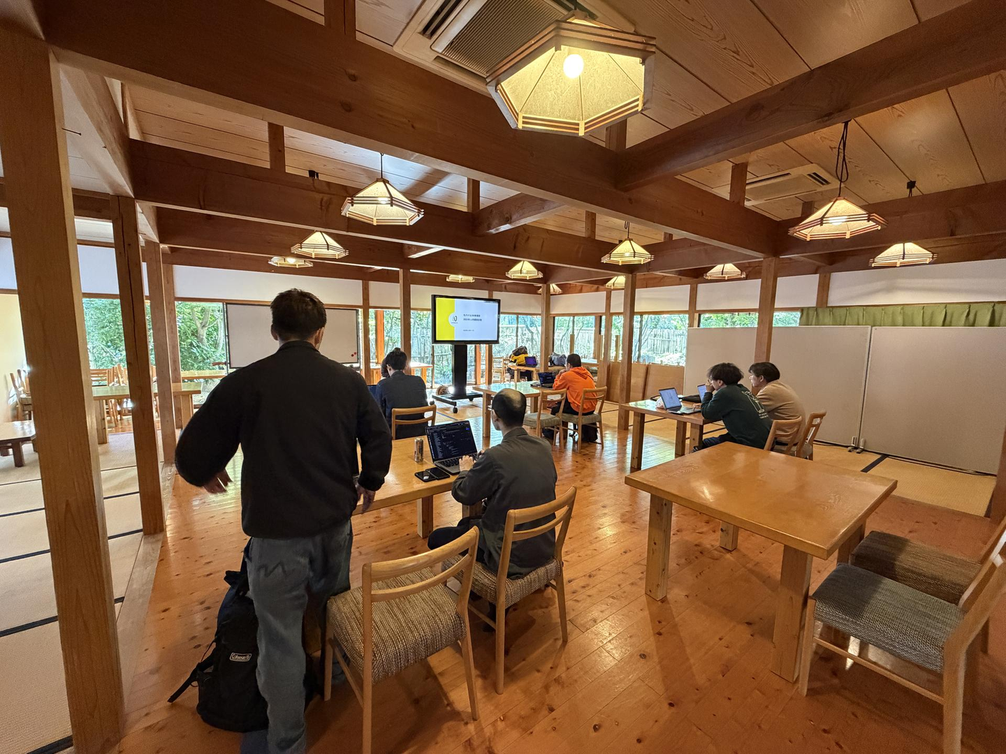 午後は会場を移し、木造の温かみある施設で開発を続行。