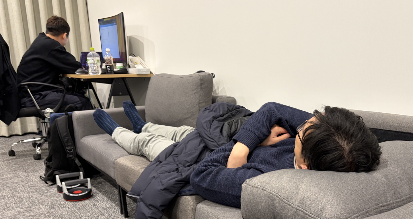 仕事の合間に昼寝をするエンジニアの姿が日常です。