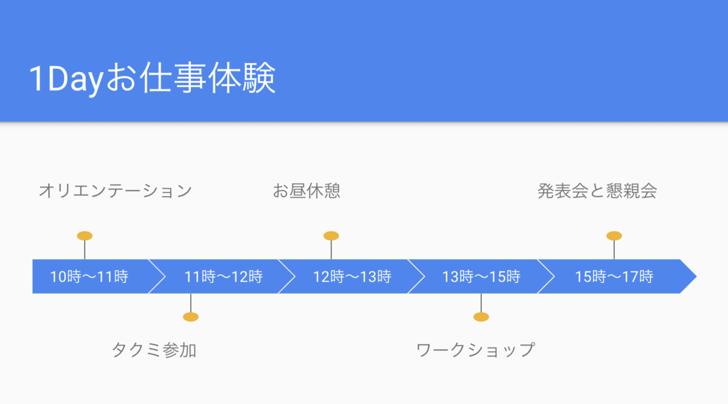 1日だけのお仕事体験ということもあり結構盛りだくさんになりがちなので、参加者の学生さんに程よいプレッシャーと楽しく会社を知ってもらえる時間になればと思い上記の流れで計画しました。