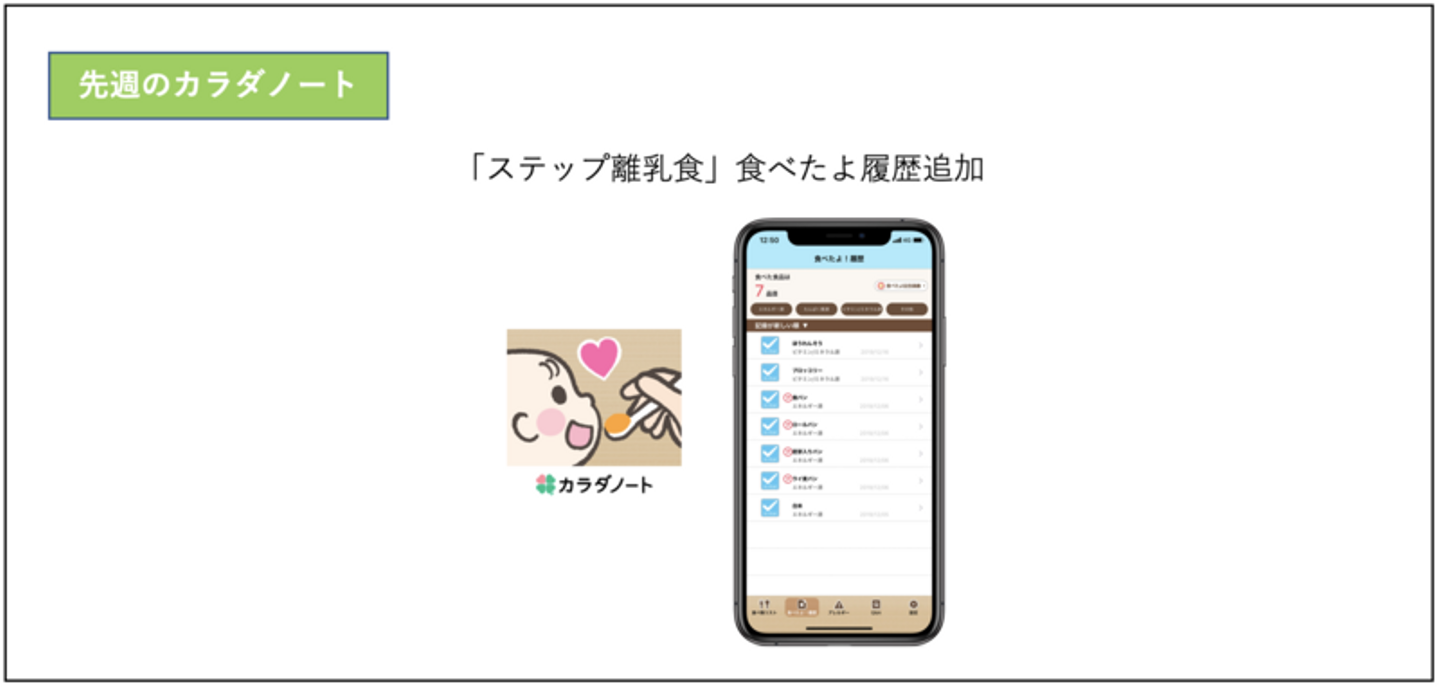 離乳食の食材管理アプリ「ステップ離乳食」にて、食べた食材の履歴を一覧で確認できるようになりました。今回のアップデートによりひと目で進み具合がわかるようになりました。