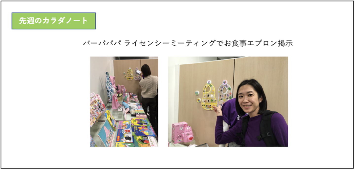 バーバパパのライセンシーミーティングにて、カラダノートがバーバパパとコラボしたお食事エプロンをご紹介いただきました。来年はバーバパパが50周年を迎える年となり、注目が集まっていました。