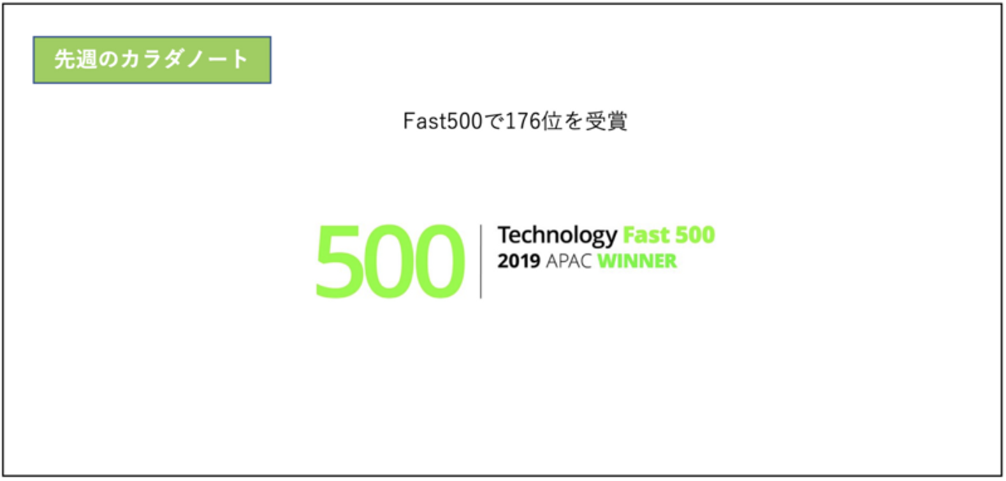 デロイト トウシュ トーマツ リミテッドが発表した、テクノロジー・メディア・通信業界の売上高に基づく成長率のランキング 「デロイト 2019年 アジア太平洋地域テクノロジー Fast 500」にて、 過去3決算期の収益(売上高)に基づく成長率456%を記録し、500位中176位を受賞いたしました。今後も事業領域の拡大を含めて、挑戦を続けてまいります。