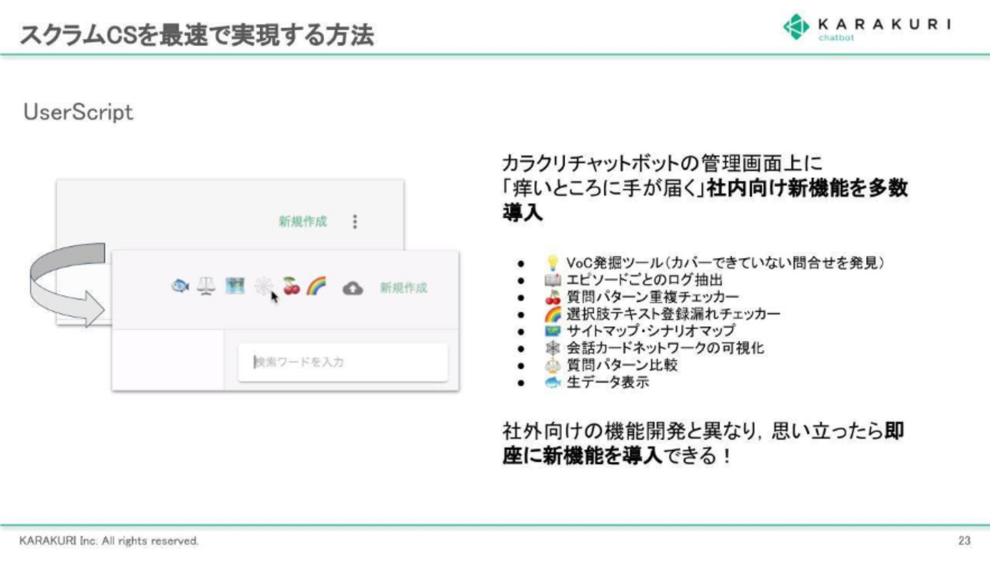 UserScriptはブラウザでユーザーが用意したスクリプトを実行する為の仕組のことを言います。これを使って、カラクリではchatbotの管理画面を強化し、繰り返しやらなくてはいけない作業などを自動化しています。