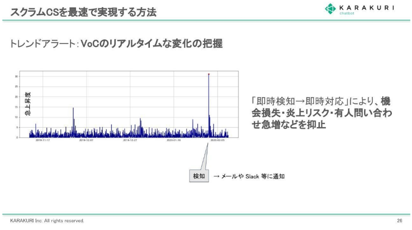 VoCのリアルタイムな変化を把握するためのツールです。キャンぺーンや時事で急増した問い合わせなどの“異変”を、素早く察知します。これにより、chatbotに追加すべき対策を迅速に行なえるのです。つまり、「即時検知→即時対応」の実現により機会損失・炎上リスク・有人問い合わせの急増を抑止することができます。