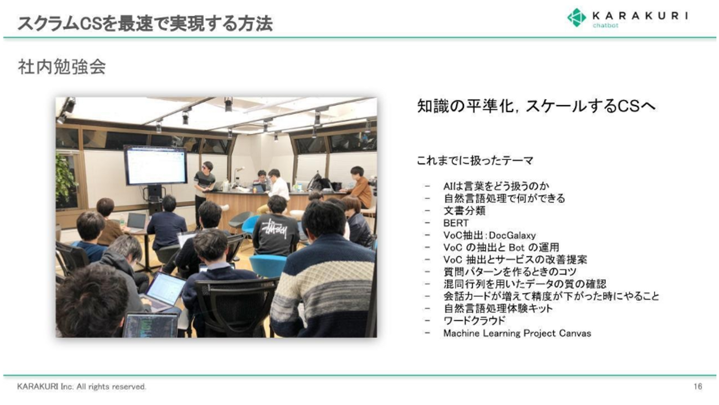 スクラムCSを最速で実現するために、R&Dチームでは社内勉強会を定期的に開催しています。これは部署関係なく、機械学習などの知見を浸透させることで、非エンジニアでも「AIを使いこなす」「プログラミングができる」ことを目指しています。