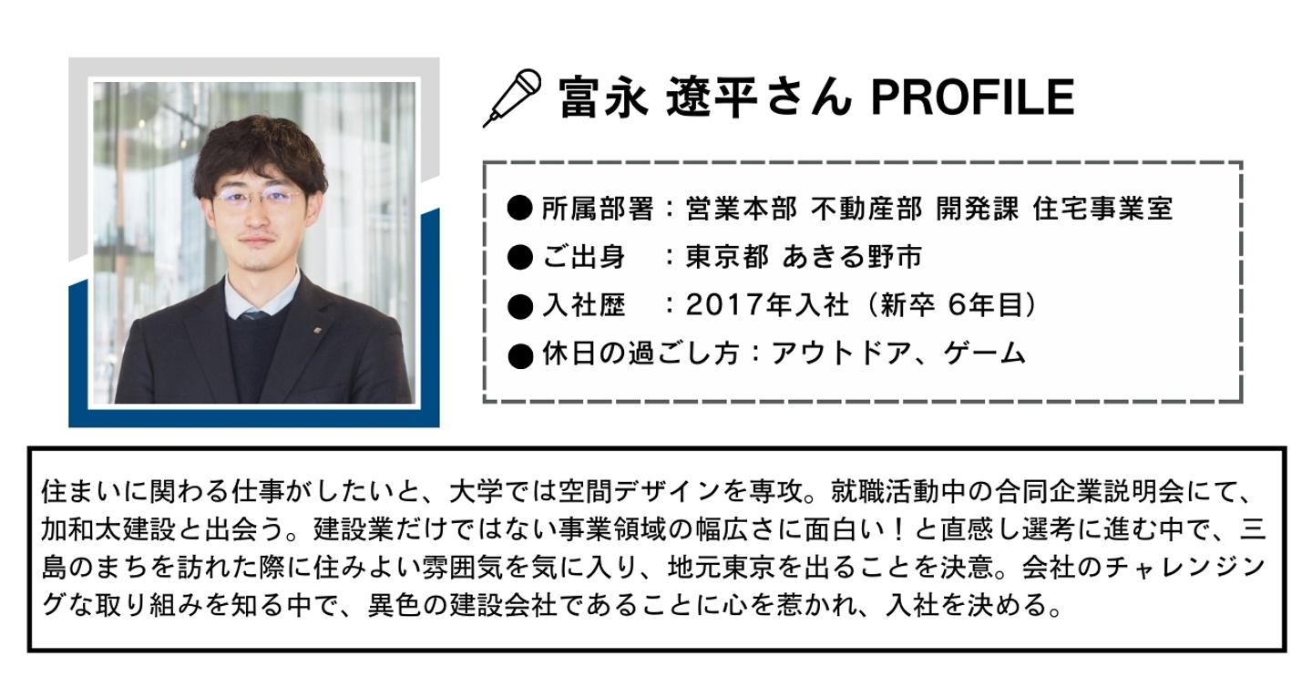 加和太建設が実現したいこと「世界が注目する元気なまちをつくる」この目標に向かって、日々頑張る仲間たちがいます。今回は、静岡県東部エリアの不動産売買を担当する不動産部 開発課 住宅事業室の富永 遼平さんに、お仕事に対する想いや、つくっているまちの元気について聞いてみました!