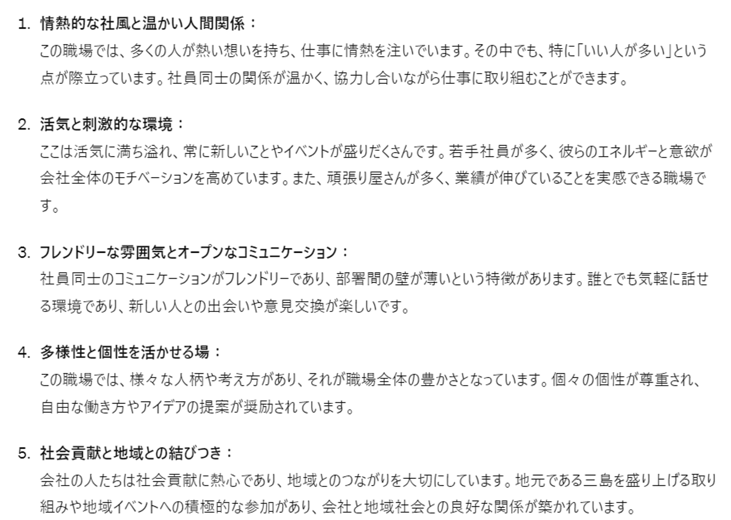 「加和太建設は人が素敵、仲間が好き!」という意見が大多数でした。日頃から、チームワークを大切にしながらチャレンジする姿勢や、オープンな社風を魅力に感じているメンバーが多いようです。また、ミッションである「世界が注目する元気なまちをつくる」ために、ものづくりや施設運営など幅広いまちづくりを通じて、まちとのつながりを大切していることも特徴の1つだと言えます。