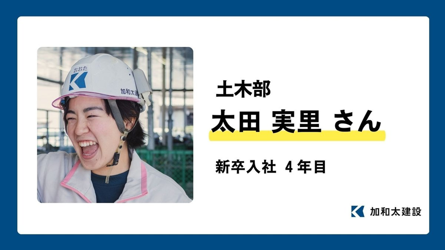 また、土木部に配属を迎えたときは、気合、根性、人情、使命感など、技術者としての精神を体現し冷静だけれども心は熱い先輩が多く心打たれました。入社して4年目になりますが、未だに加和太建設の人に惹かれ、仲間と一緒に働けることに喜びを感じながら日々の業務に励んでいます!