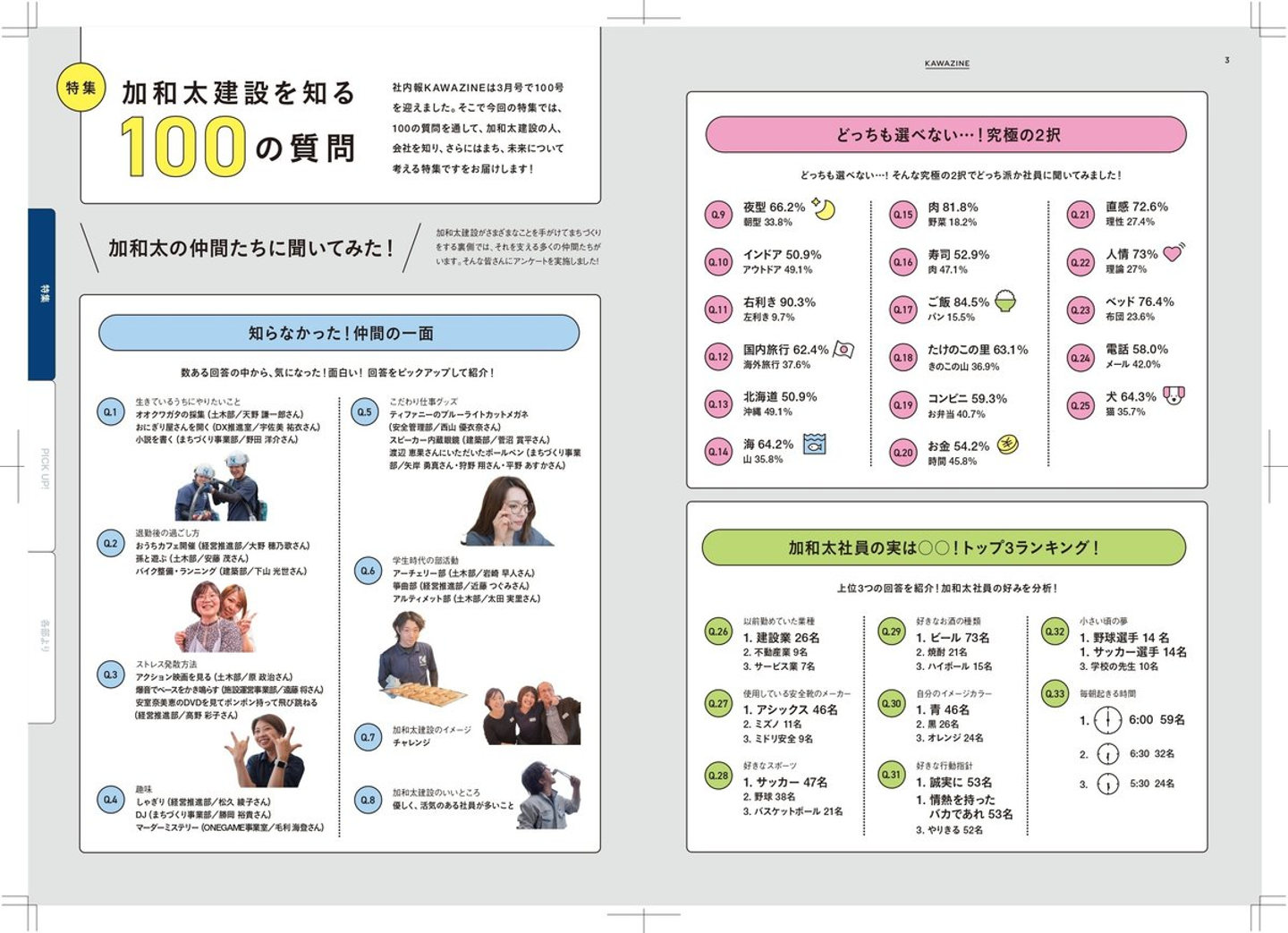 社内報KAWAZINEが2023年12月に記念すべき100号を迎えました。冊子内の特集では全社アンケ―トを実施し、「加和太建設を知る100の質問」をお届けしました。今回は集計した回答を活用し、ChatGPTで要約。社員が思う加和太建設の好きなところを明らかにしました!