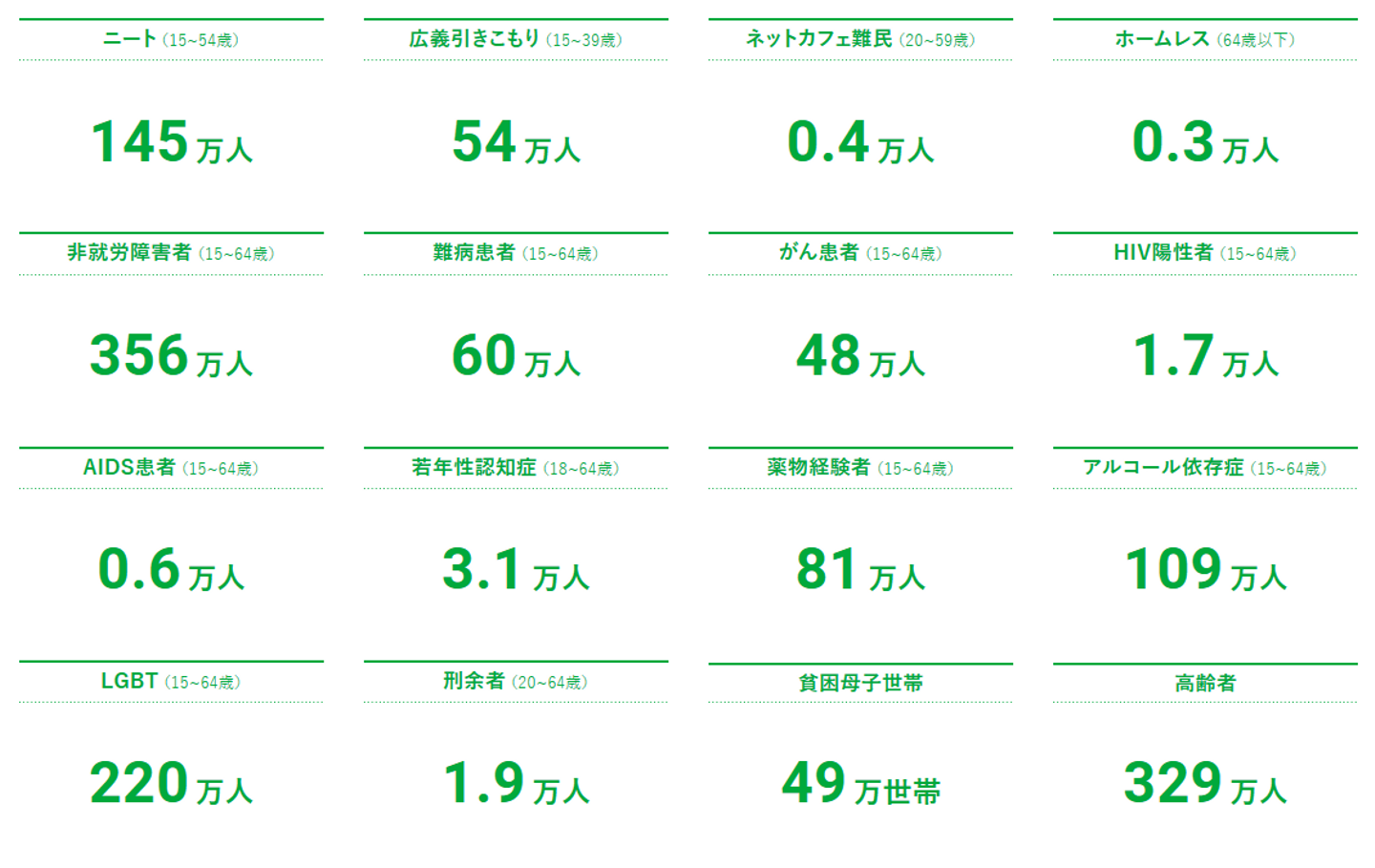 現在の日本では、働きづらさを抱える人が1,500万人いるといわれています(日本財団HP)。