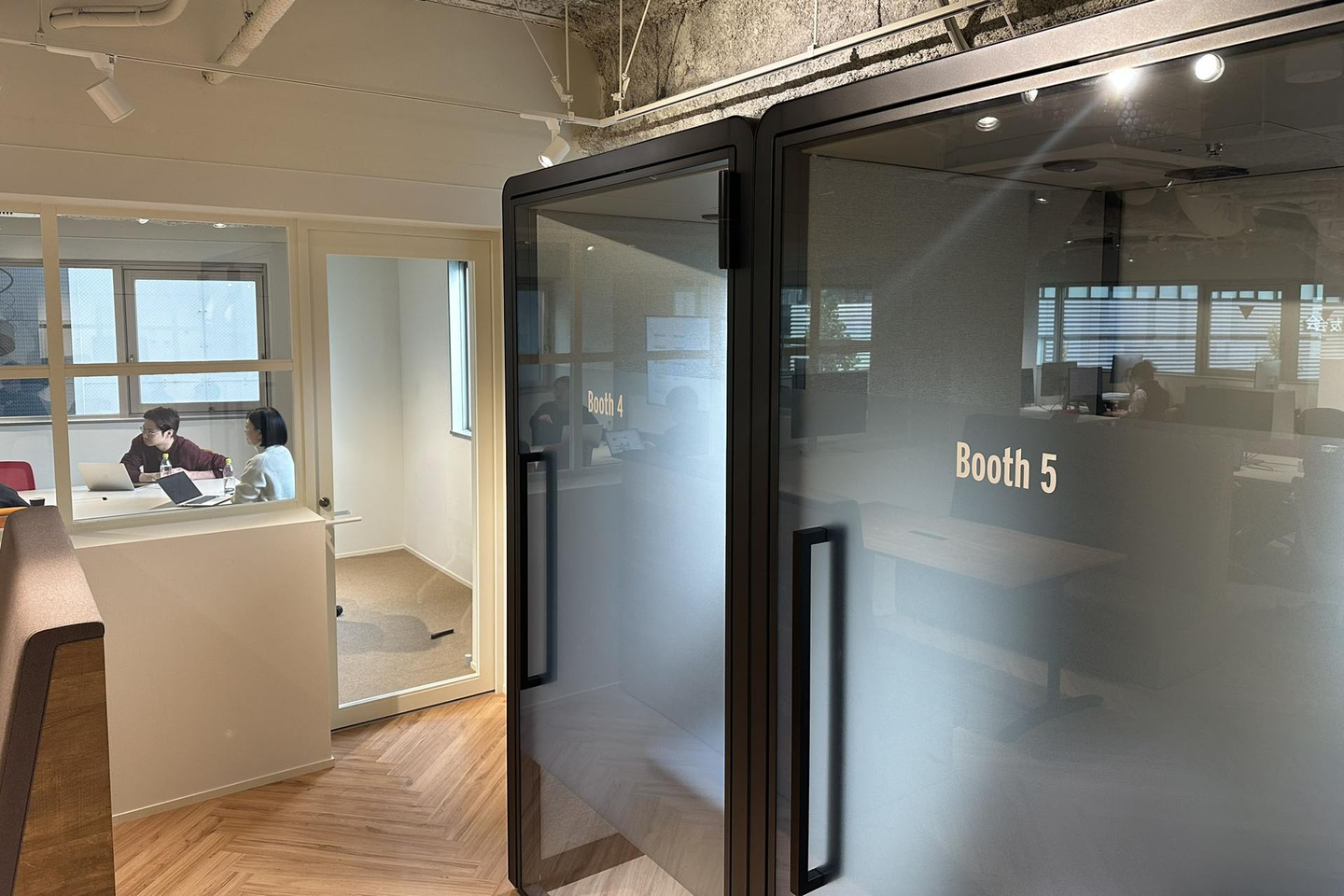 入口入って右手には電話ブースが2部屋とミーティングルームがあり、さまざまなタイプの打ち合わせを実施できます!ミーティングルームは日差しの入る明るい空間です。
