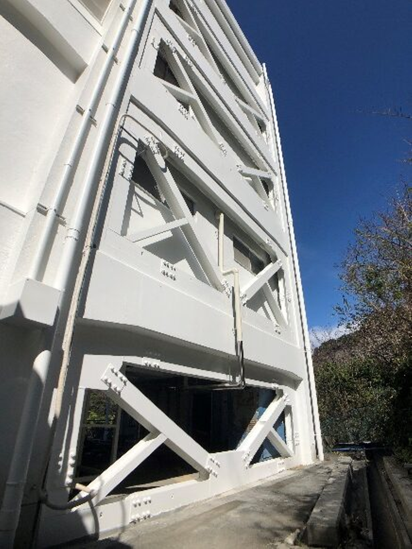 ↑ 鉄骨ブレースで建物の外側を補強