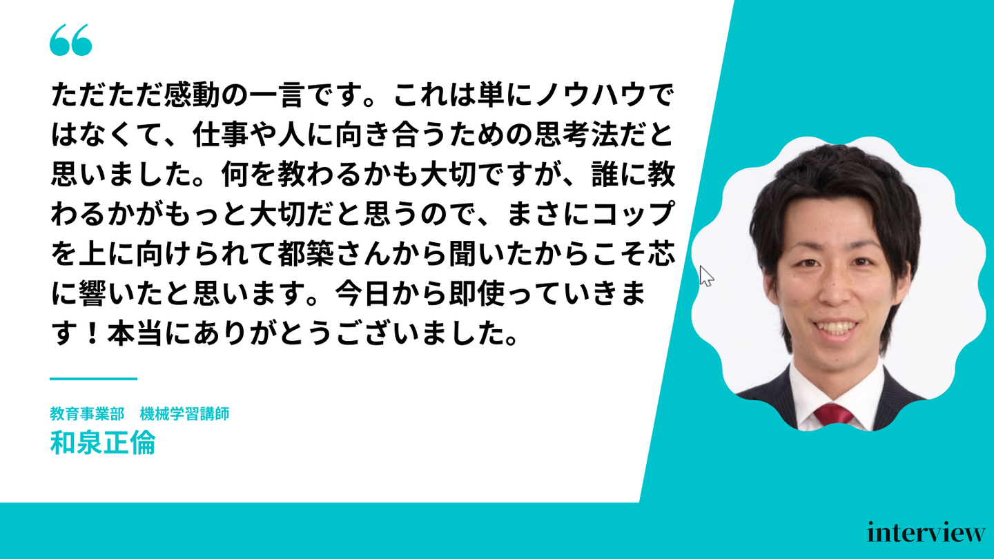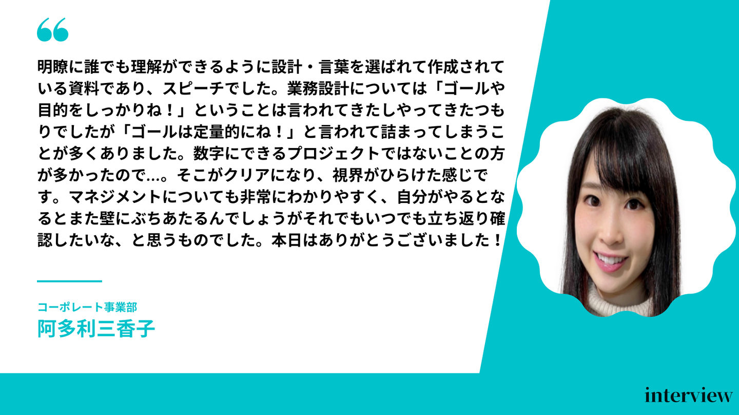 最初は手こずったものの都築さんに何度かフィードバックをもらうことによって、いろんな気付き、そしていかにいままで業務設計の詰めが甘かったのかと実感しました。